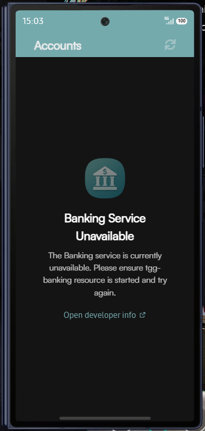 The Banking App automatically detects when the tgg-banking resource starts or stops, updating its availability in real-time. If the resource is stopped, the app will show an unavailable screen. When the resource starts again, the app will automatically become available.